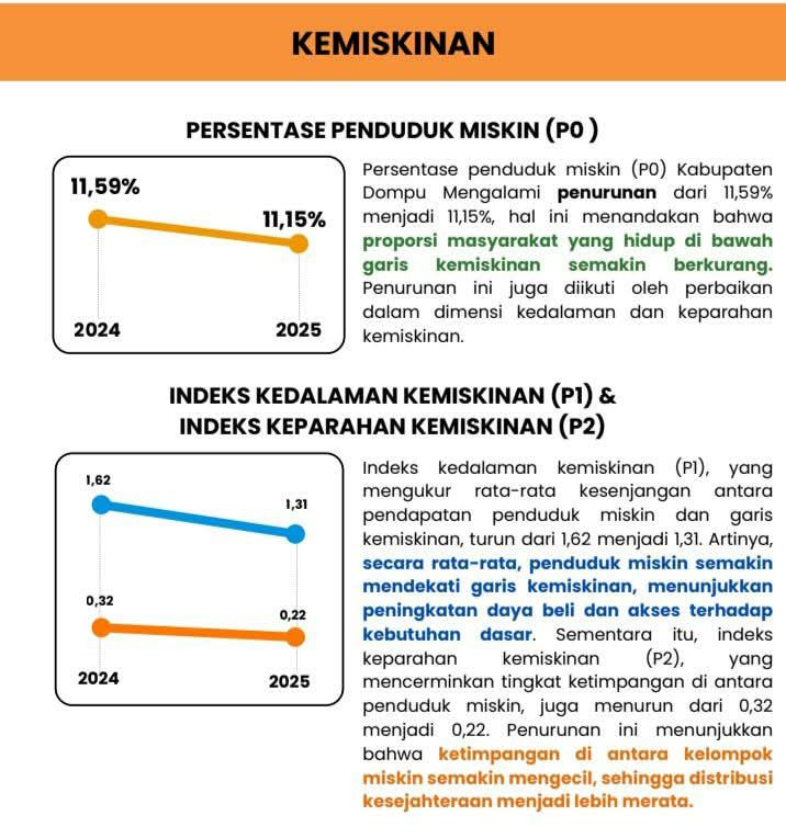 Kepala Badan Pengelolaan Keuangan dan Aset Daerah (BPKAD) Kabupaten Dompu, Muhammad Syahroni, mengungkapkan bahwa meskipun penurunan persentase penduduk miskin secara angka hanya sebesar 0,44 persen, dari 11,59 persen pada 2024 menjadi 11,15 persen pada 2025. namun kualitas penurunannya dinilai jauh lebih bermakna.